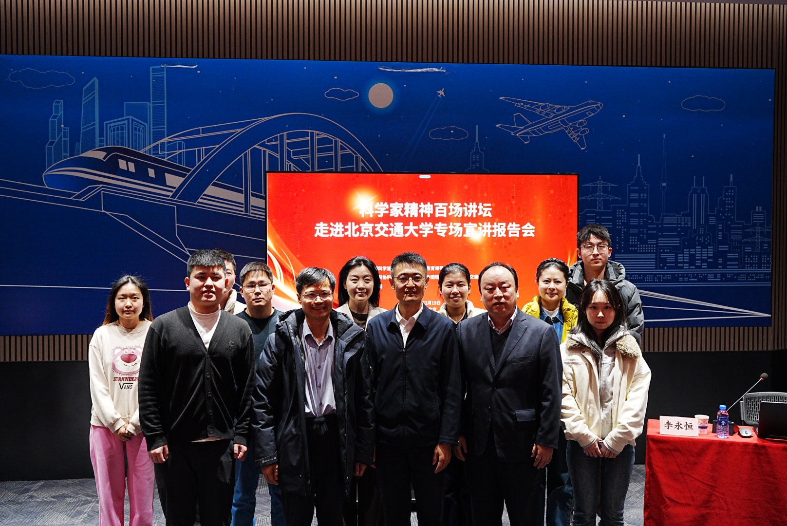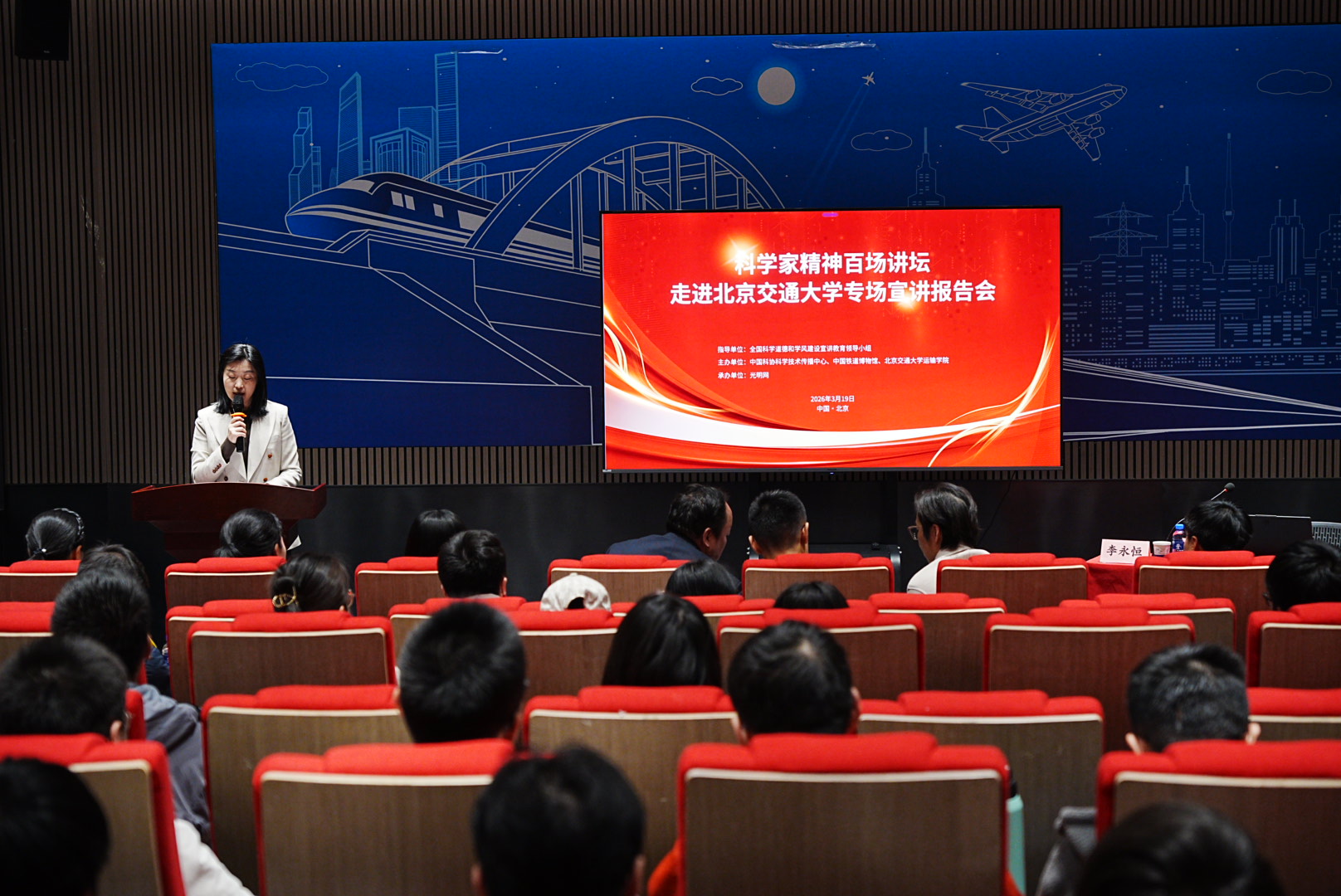 2026年3月19日,“科学家精神百场讲坛”走进人妻av 专场宣讲报告会在交通运输科学馆成功举办。“科学家精神百场讲坛”是由全国科学道德和学风建设宣讲教育领导小组指导的全国性品牌活动,本次进校园专场活动由中国科协、中国铁道博物馆、人妻av 联合主办,由光明网承办。本次讲座也是学院迎校庆、开办“运输大讲堂”系列讲座活动之一。国铁集团科技和信息化部装备技术处处长李永恒,中国铁道博物馆副馆长傅梅胜,人妻av 党委书记孙冬梅,人妻av 研究生工作部副部长王萌,人妻av 党委副书记、副院长陈军华出席活动。本次讲座由中国铁道博物馆社教部副主任杜媛主持。