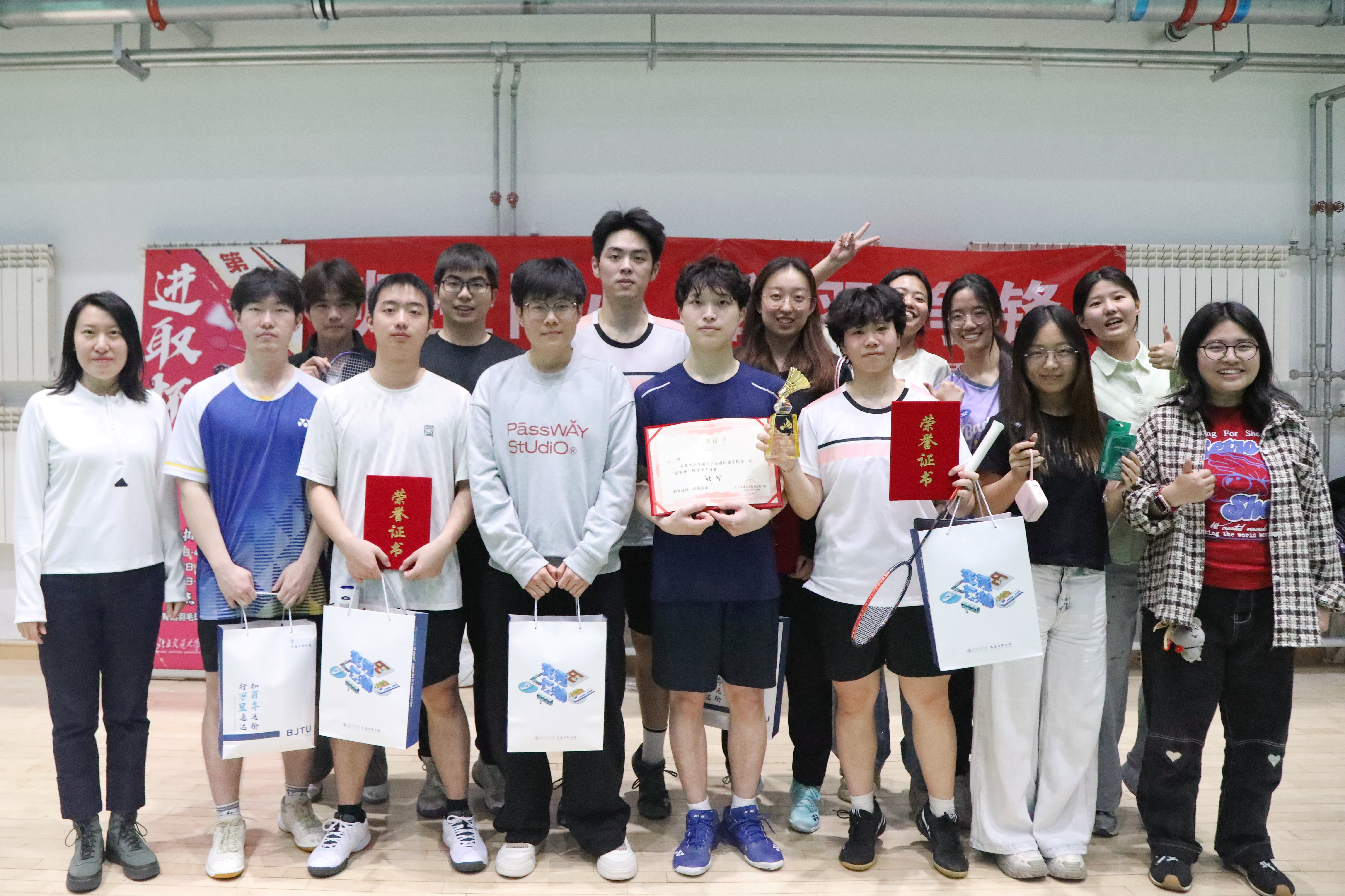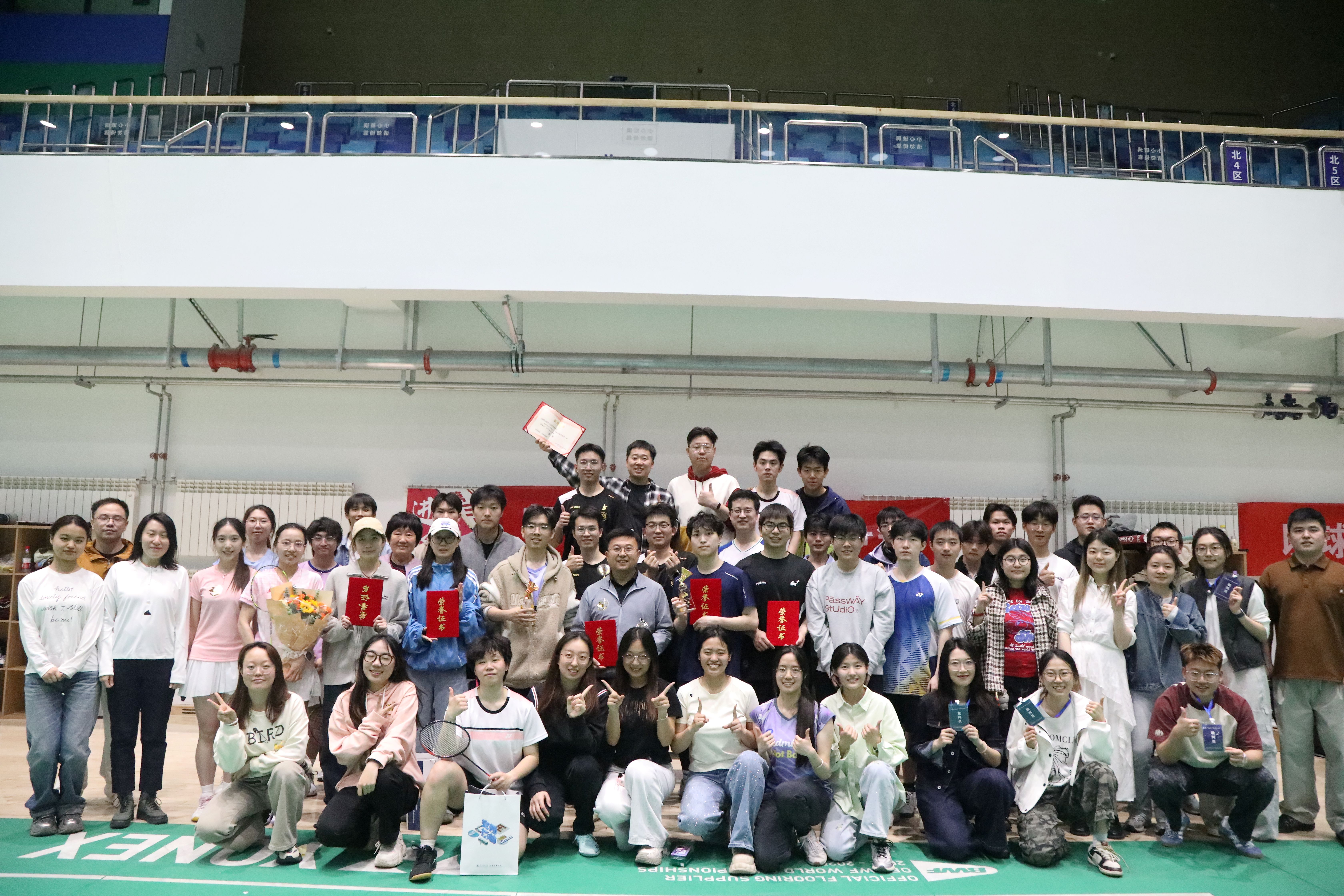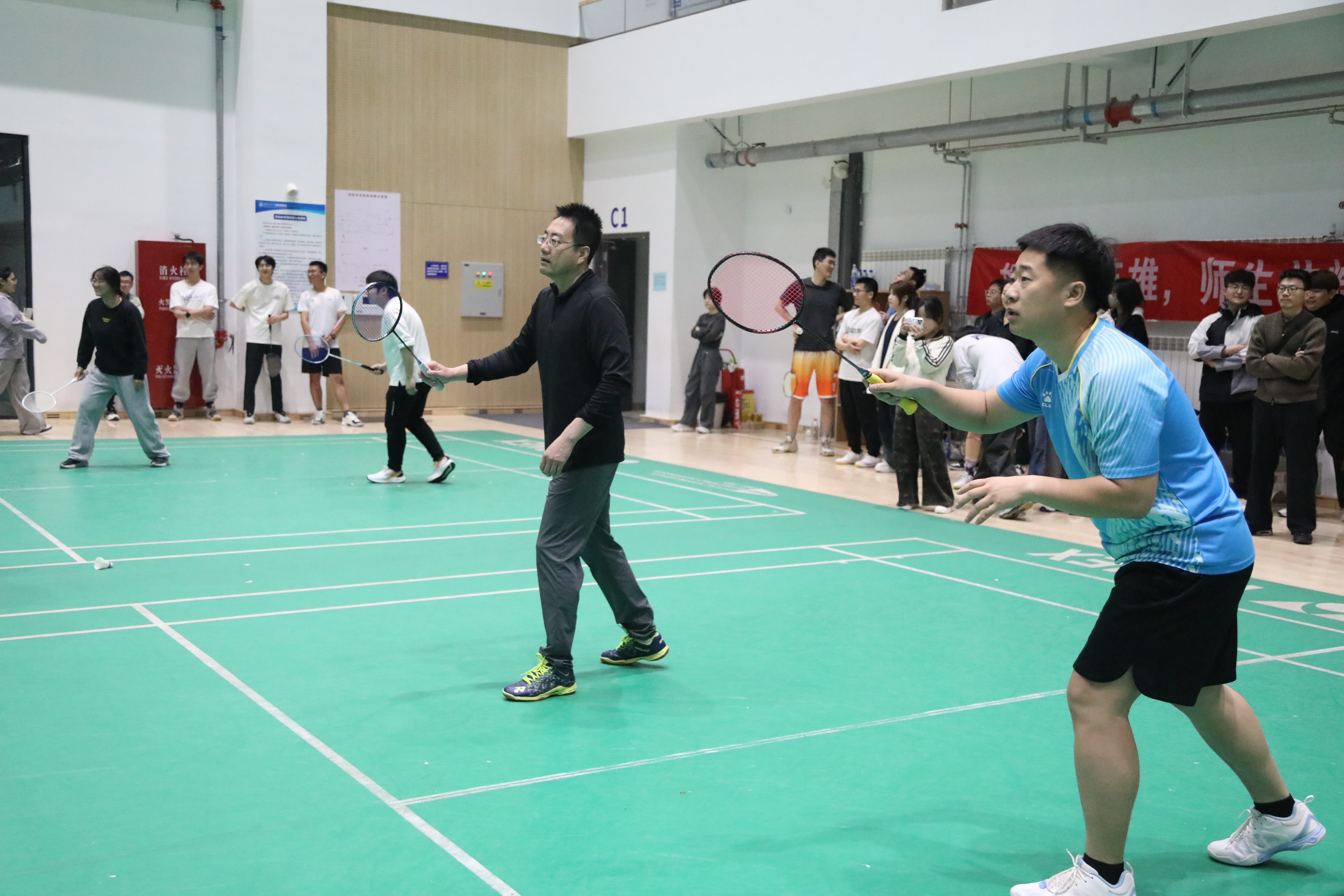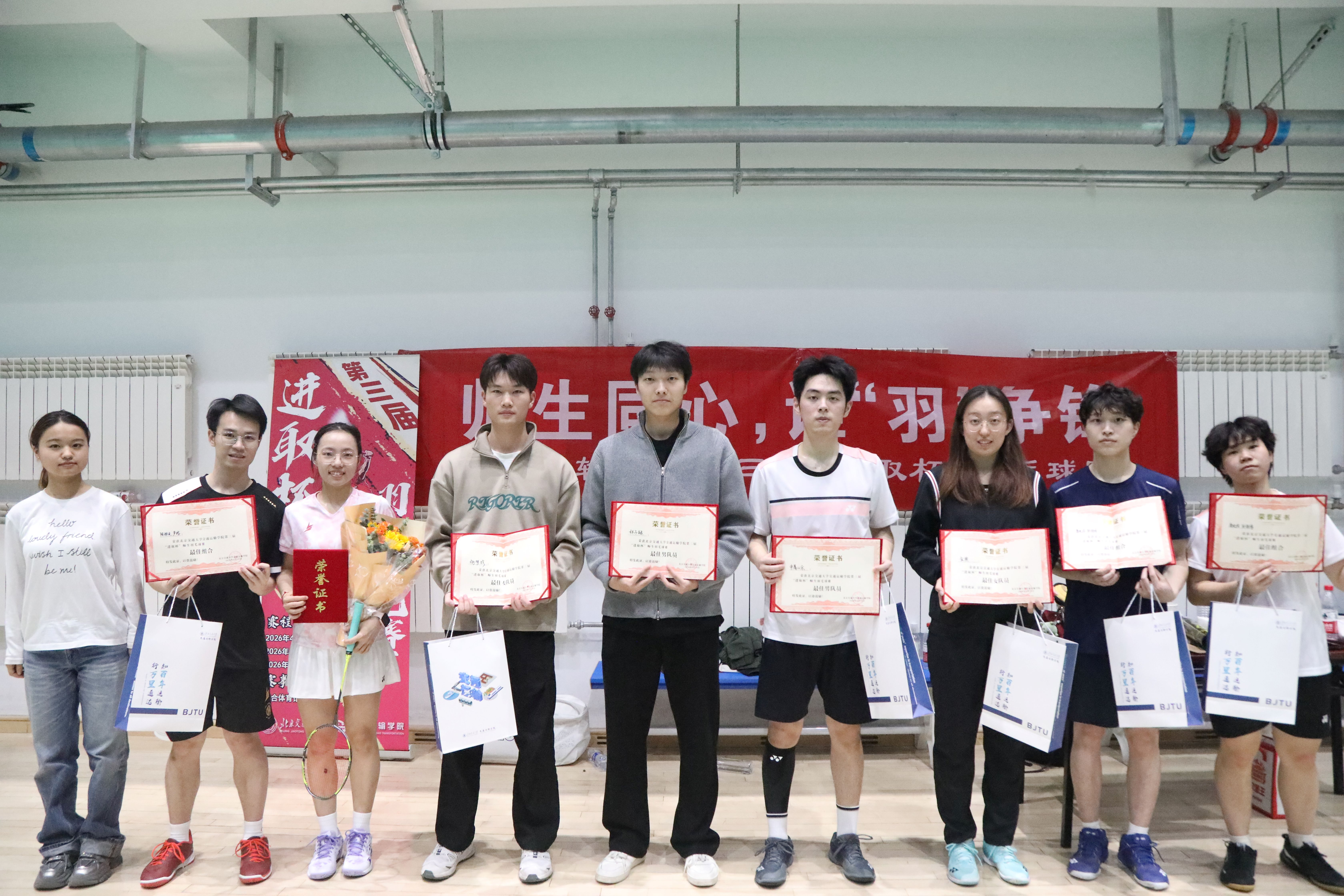 为迎接百卅校庆,弘扬拼搏精神,激发奋进活力。2026年4月19日,人妻av 第三届“进取杯”师生羽毛球赛决赛暨颁奖仪式在综合体育馆羽毛球训练馆举行,为期10天的赛程落下帷幕。人妻av 党委副书记、副院长陈军华,党委副书记于海妹,本研辅导员老师和参赛师生共同参加闭幕式。